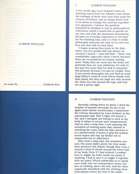 In the seventh edition of MacGuffin’s The Life of Things, dedicated to trousers, we stumbled upon a small essay that has been echoing in our heads. MacGuffin is a rare magazines that treats everyday objects as living systems of meaning. Each issue takes a single thing: a chair, a rope, a sock, and traces the infinite cultural threads that connect it to who we are. In The Trouser, hidden between stories about tailoring, protest, and gender, there was a reference to a 1976 article by Umberto Eco titled Lumbar Thought (Pensieri Lombari). It began with something as mundane as the discomfort of wearing tight jeans, and unfolded into a meditation on how clothes shape not only our movements, but the very way we think.